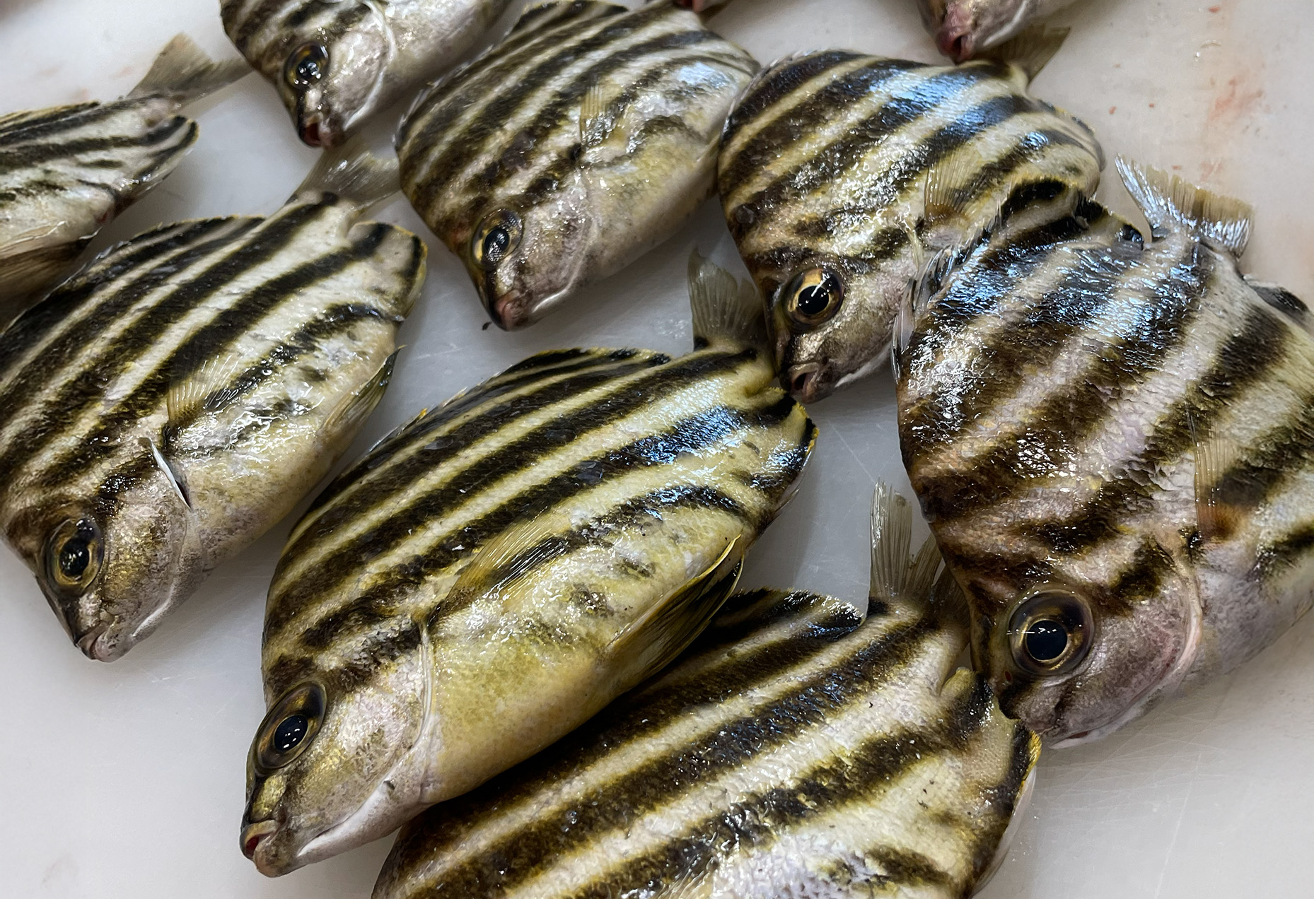 面白い魚紹介カゴカキダイ2025.12.18 手の平サイズの縞々模様のかわいい子。こんなサイズにも神経〆手当をしてくれる漁師さんには感謝でしかありません。小さい魚体ですが皮目と身の間にはしっかりと脂があって塩焼きも美味しいお魚です!